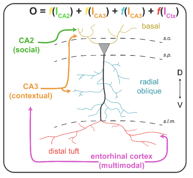 Let’s dial things up a notch. This CA1 neuron receives most of its excitatory synaptic signals from three different brain circuits: CA2, CA3 and Layer II/III of the entorhinal cortex. These circuits send different types of information to CA1, and each information stream is important and complementary to the others.