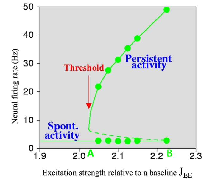 Though cortical regions share a generic canonical circuit organization, they also show biological heterogeneities—and bifurcations can help explain how these differences might underlie different functional capabilities. Experiments indicate that in primates, but perhaps not in rodents, excitatory-to-excitatory connections are more abundant in the prefrontal cortex (PFC) than in primary sensory areas. Computational modeling has shown that, in a generic recurrent local circuit, when the strength of recurrent excitatory connections exceeds a threshold level, stimulus-selective and self-sustained persistent activity suddenly emerges through a bifurcation (see figure). This could explain why information-specific persistent activity underlying working memory—the brain’s ability to internally maintain and manipulate information in the absence of sensory inputs—is commonly observed in the PFC.