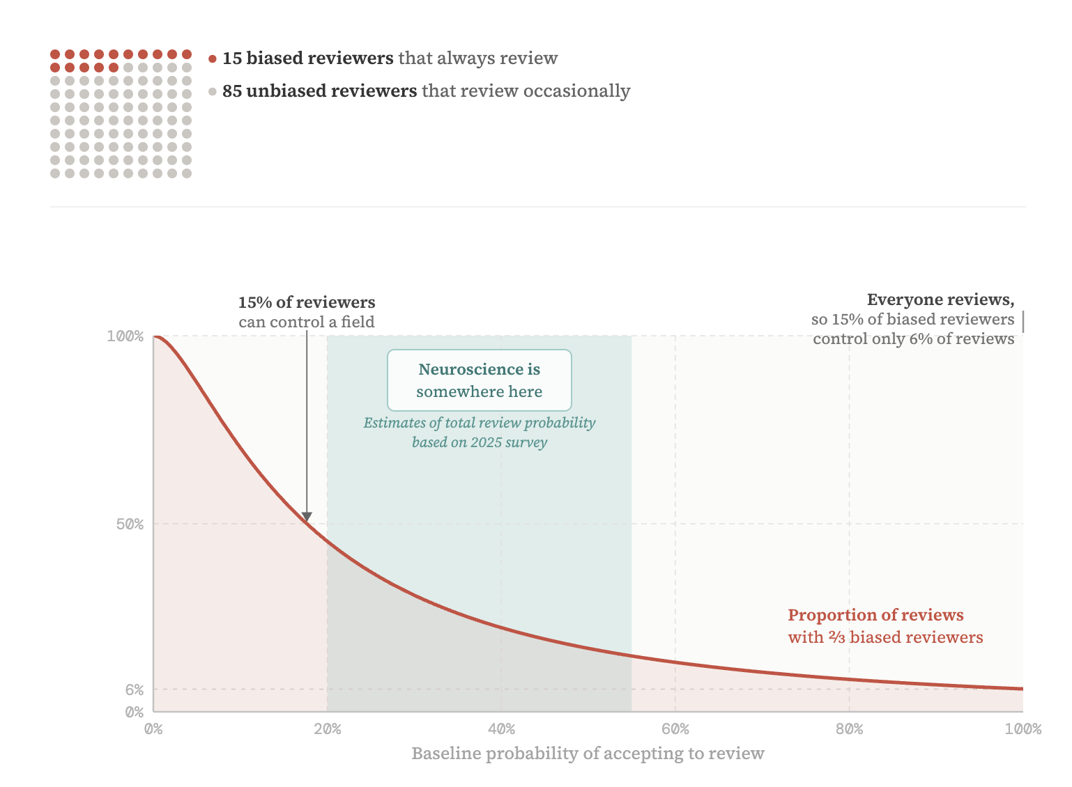 The problem with current peer review, however, is not that fields are small but that the number of scientists who actively review is much smaller: From a survey we conducted in 2024 and 2025 of editors at major neuroscience journals, we found that depending on the subfield, journal and editor, only 20 to 50 percent of review requests are accepted.