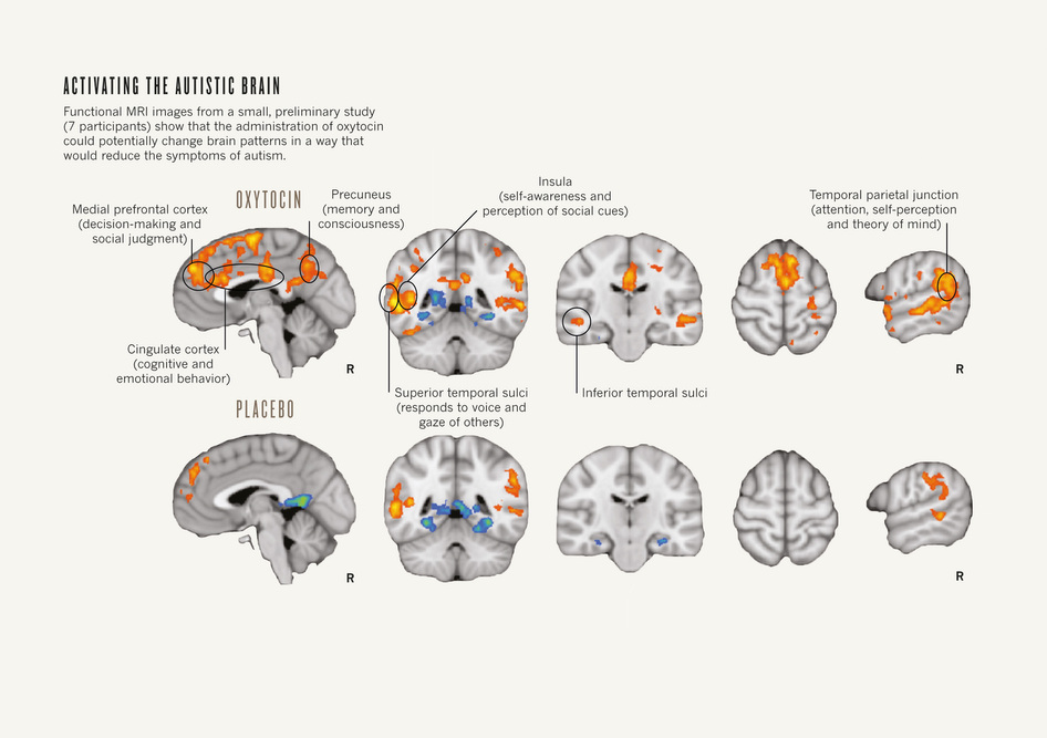 No medications target the core symptoms of autism, which include attention deficit, abnormal social behaviour and poor ability to communicate. Accordingly, when a potential treatment option for these symptoms is ident-ified, it grabs the community’s attention. For example, extensive research in both animals and humans has identified a prominent role for the hormone oxytocin in behaviours associated with trust, empathy and attachment — emotions commonly impaired in people with ASDs (see ‘Activating the autistic brain’). At least half-a-dozen clinical trials are underway to test whether oxytocin affects these traits in people with ASDs.