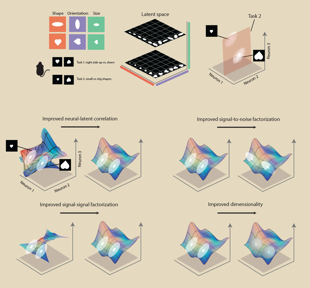 Four terms in that error formula predicted the neural population’s ability to generalize: a higher correlation between neural activity and the task-related variables; a higher dimensionality of the neural responses; increased signal-to-noise factorization (meaning task-unrelated noise is kept separate from the information the neural activity is tracking); and increased signal-signal factorization (meaning the population encodes different task-related variables separately from one another).